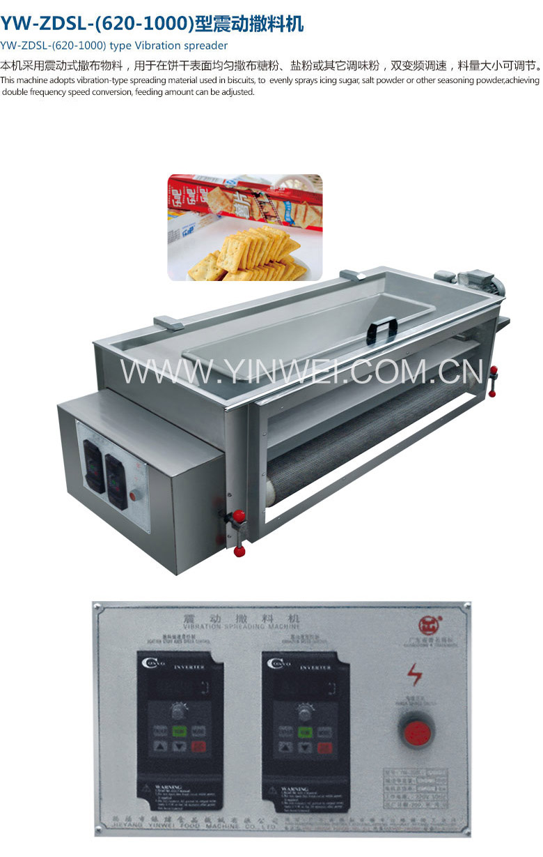 本機(jī)采用震動(dòng)式撒布物料,用于在餅干表面均勻撒布糖粉、鹽粉或其它調(diào)味粉,雙變頻調(diào)速,料量大小可調(diào)節(jié)。